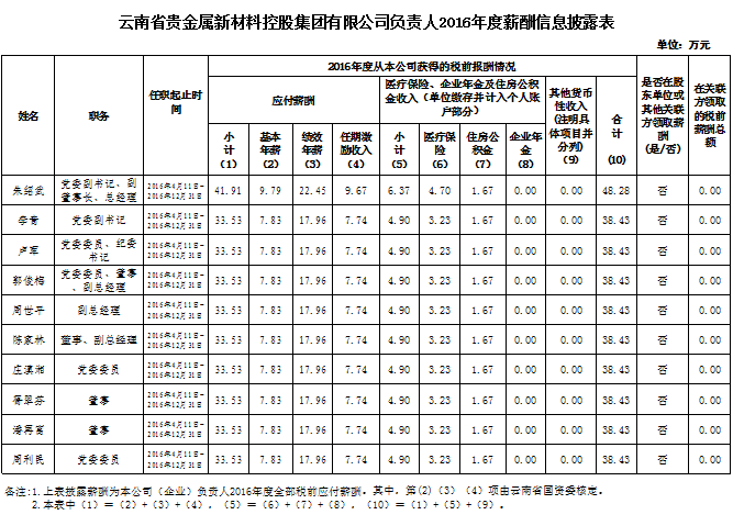 云南省贵金属金年会招牌至上有限公司负责人2016年度薪酬信息披露表