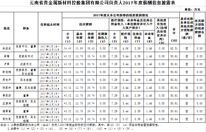云南省贵金属金年会招牌至上有限公司负责人2017年度薪酬信息披露表